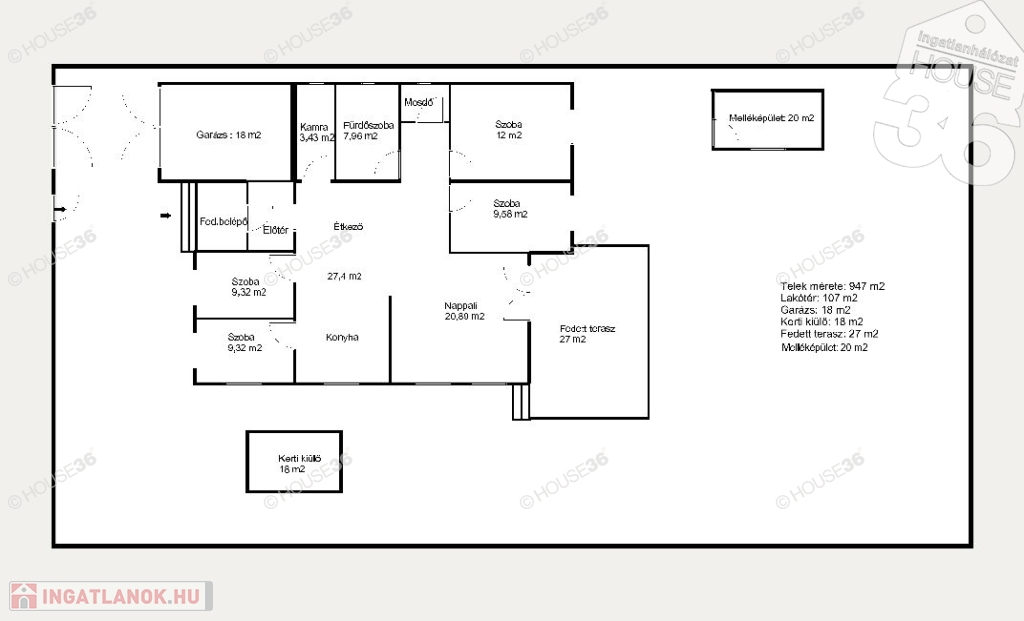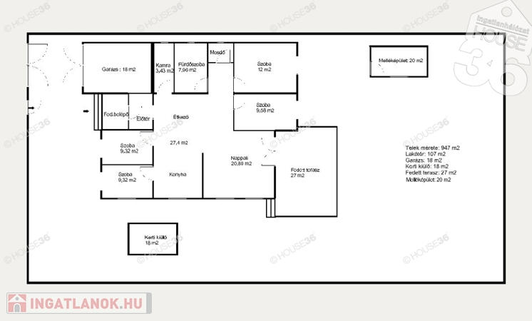 -Melléképület: 20 m2:csatorna, víz és villany kiépítve, ideális tároláshoz vagy hobbihelyiségnek