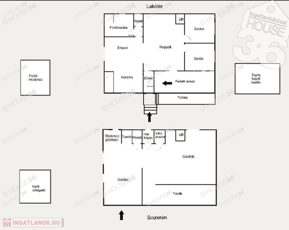 - Szuterén: nagy fűtött garázs, zuhanyzó, mosdó, infra kabin, gépészet (medence ill. lakóház), óriási tároló helyiség (jelenleg gardrób szoba) - lakrész kialakítható