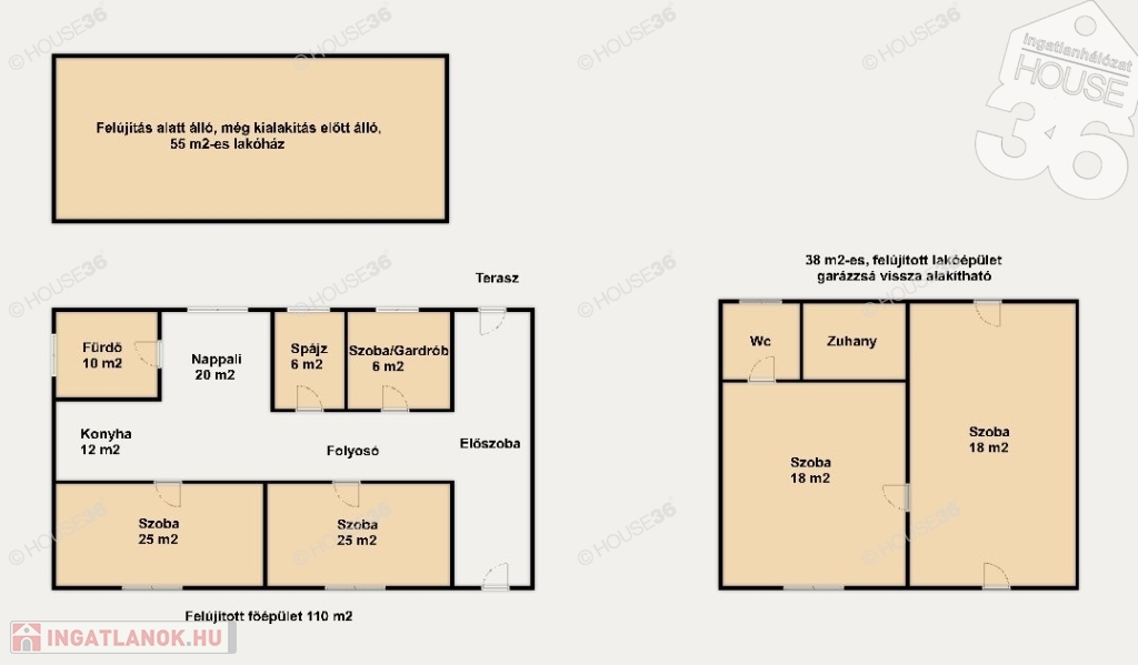 -Lakható épület: 38 m2 (teljeskörűen felújítva, fürdővel, de vissza alakítható garázzsá)