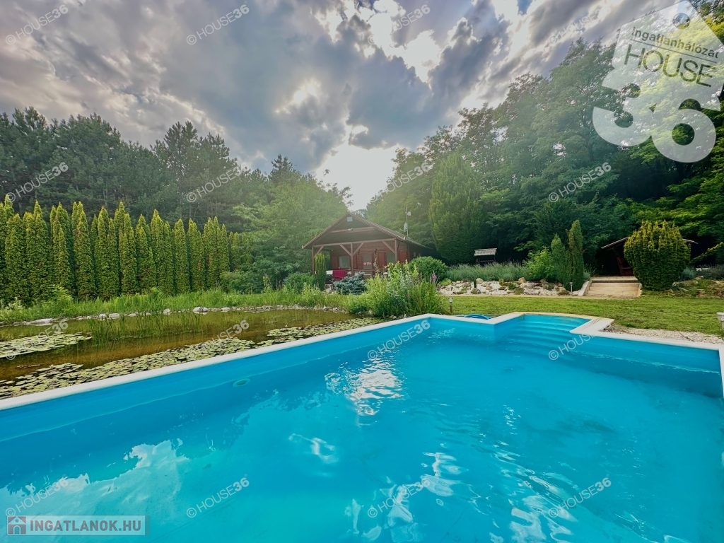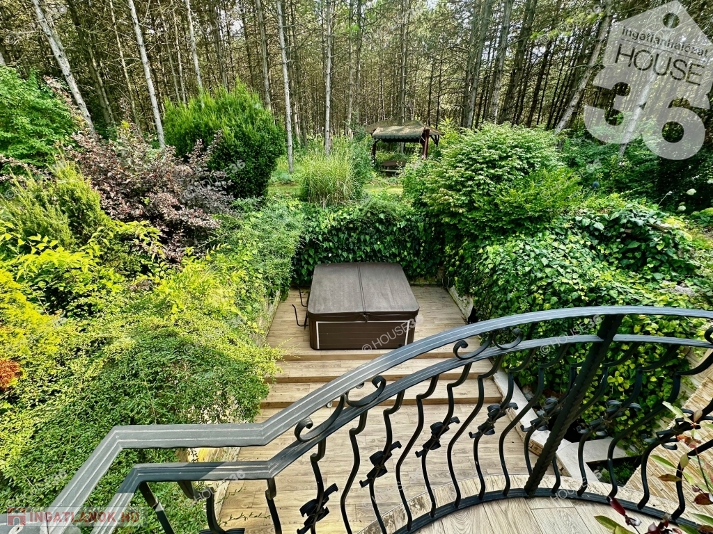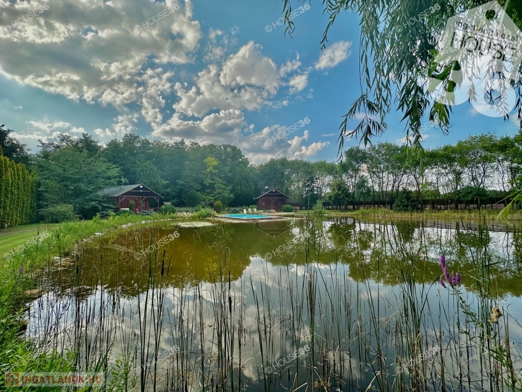 - Fenyőliget + kerti tó + tisztás teljesen körbekerítve, térkövezett utakkal, járdával