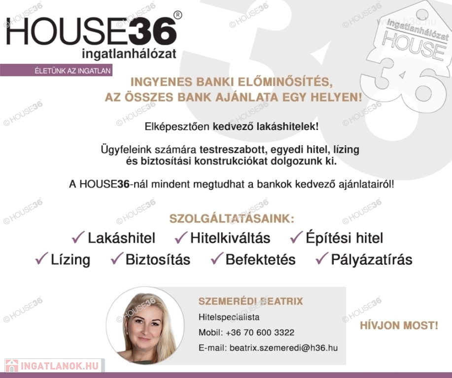 Forduljon hozzám bizalommal amennyiben felkeltette érdeklődését ez a remek lehetőség, ha eladó ingatlana van, illetve ha hitelre van szüksége! Szolgáltatásaink kereső ügyfeleink részére ingyenesek! Figyelem az adatlap megbízónktól kapott adatok alapján készült, pontosságáért felelősséget nem tudunk vállalni!