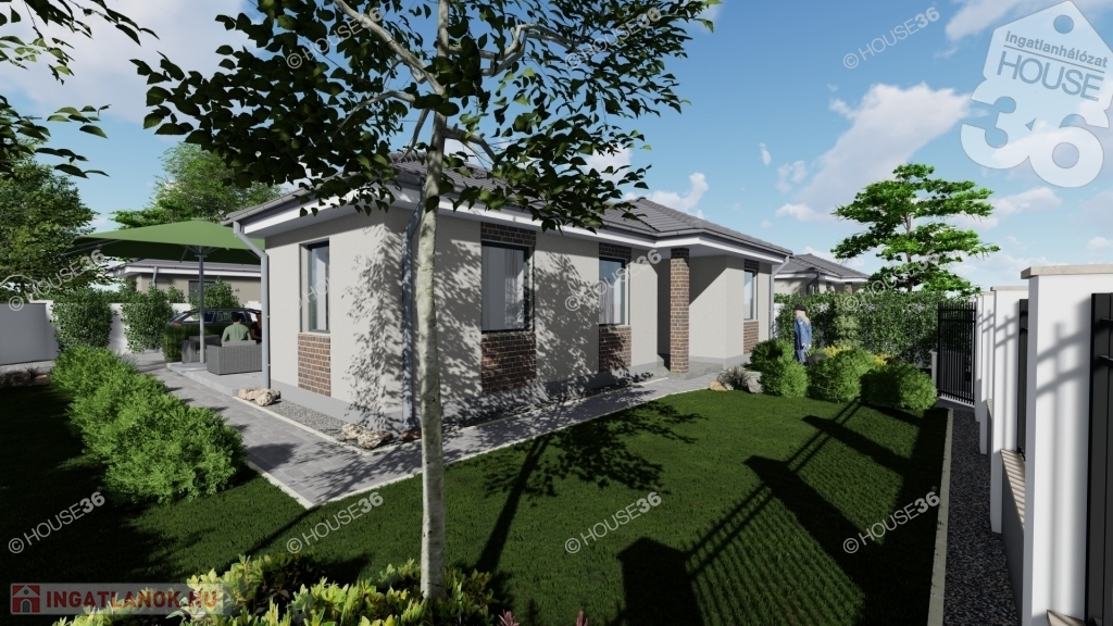 Az összközműves, betonos utcában található 520 m2-es telekre egy 91 m2-es prémium minőségű 1 szintes házat terveztek.
