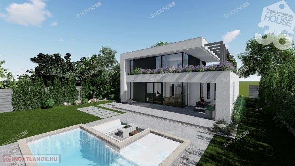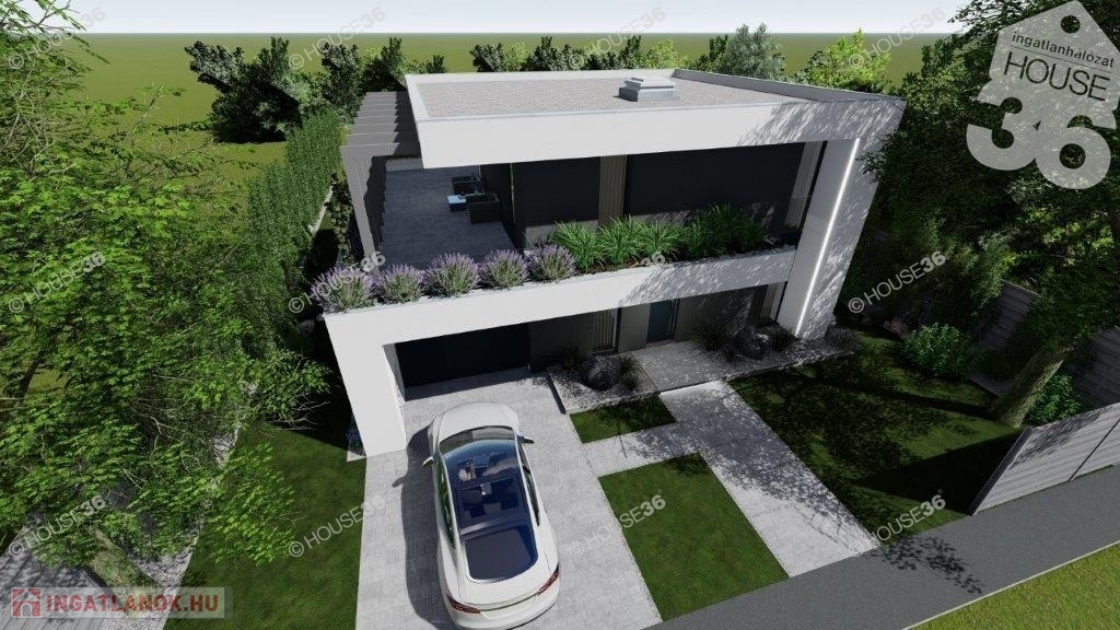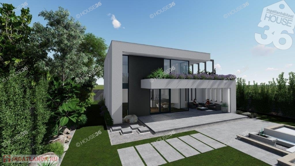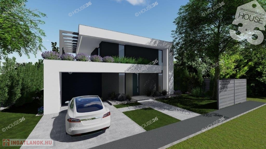 Az összközműves, betonos utcában található 910 m2-es telekre egy 126 m2-es prémium minőségű 2 szintes házat terveztek.