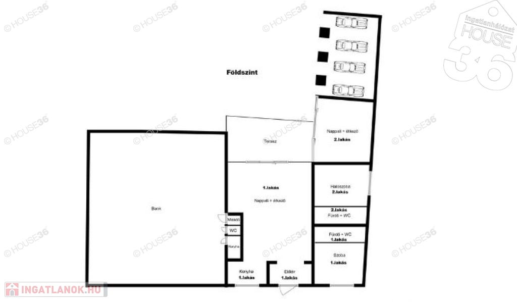 Szerkezet: a társasház 4 lakást és egy banki üzemeltetésre alkalmas egységet foglal magában