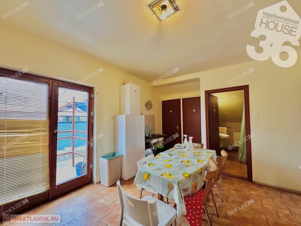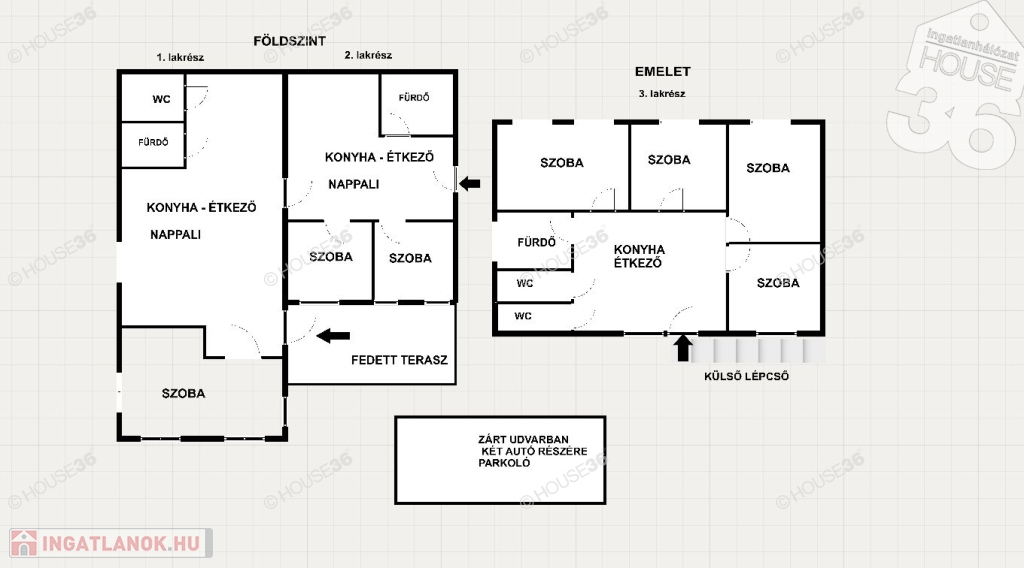 Földszinten fedett terasz és két lakrész, míg az emeleten egy lakórész található. Udvarban 2-3 autó számára parkolási lehetőség.