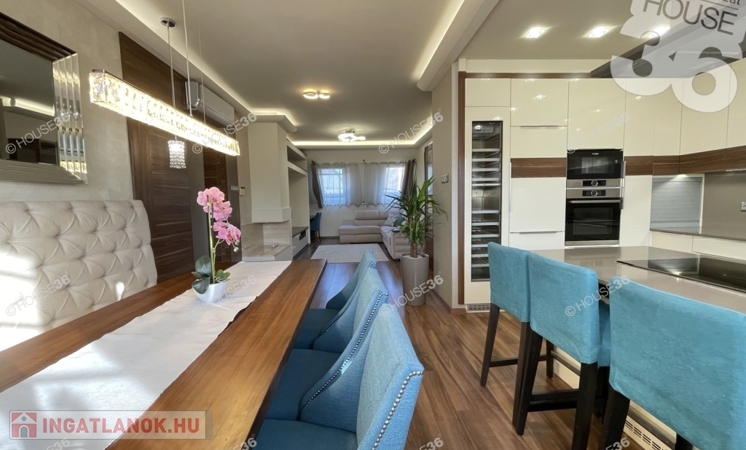 Nappali + 3 szoba, garázs, fürdő, tágas nappali étkező, amerikai konyha.