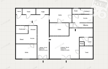 - 2.lakrész: 60 m2 : 2 szoba, előszoba, konyha, mosdó, fürdőszoba
