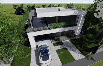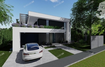 Az összközműves, betonos utcában található 910 m2-es telekre egy 126 m2-es prémium minőségű 2 szintes házat terveztek.