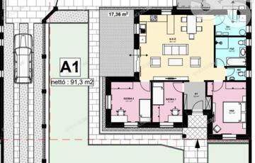 Nappali + 3 szoba, fürdő, külön wc, 18 m2-es fedett carport.